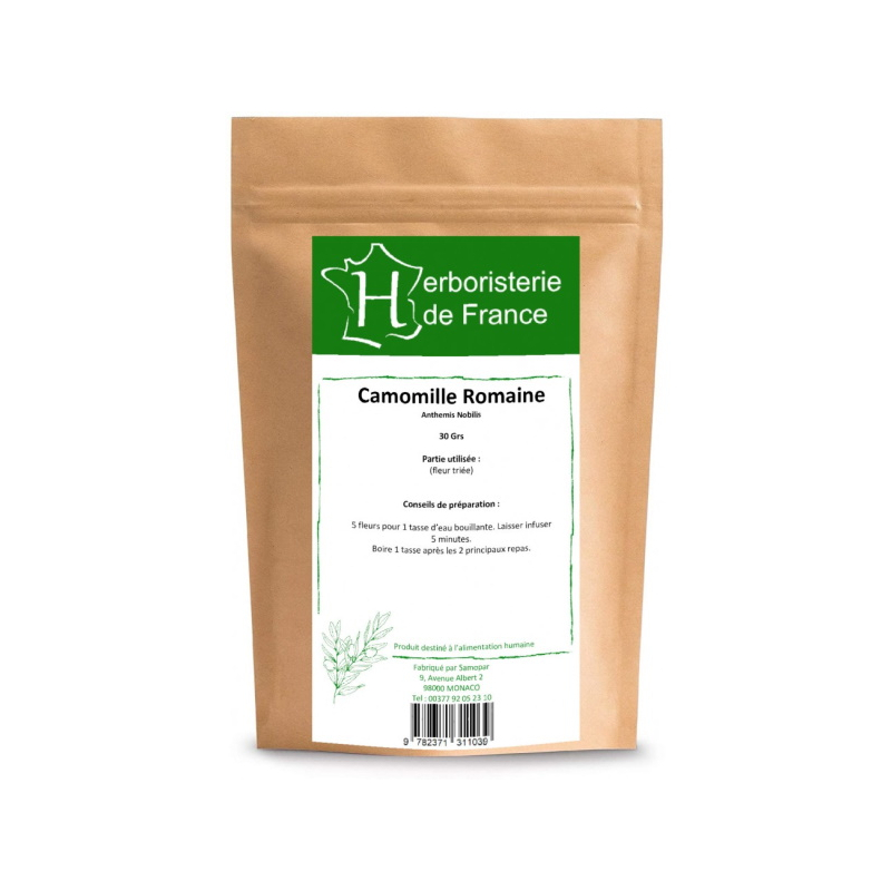 Pour calmer et déstresser votre organisme et avoir l'apport d'une action digestive douce et relaxante, en cas de lourdeurs ou de flatulences, on vous propose sans hésitation, Herboristerie De France Camomille Romaine capitule floral trié entier 30gr, pour des actifs comme les capitules floraux délicatement triés, séchés de camomille romaine.
