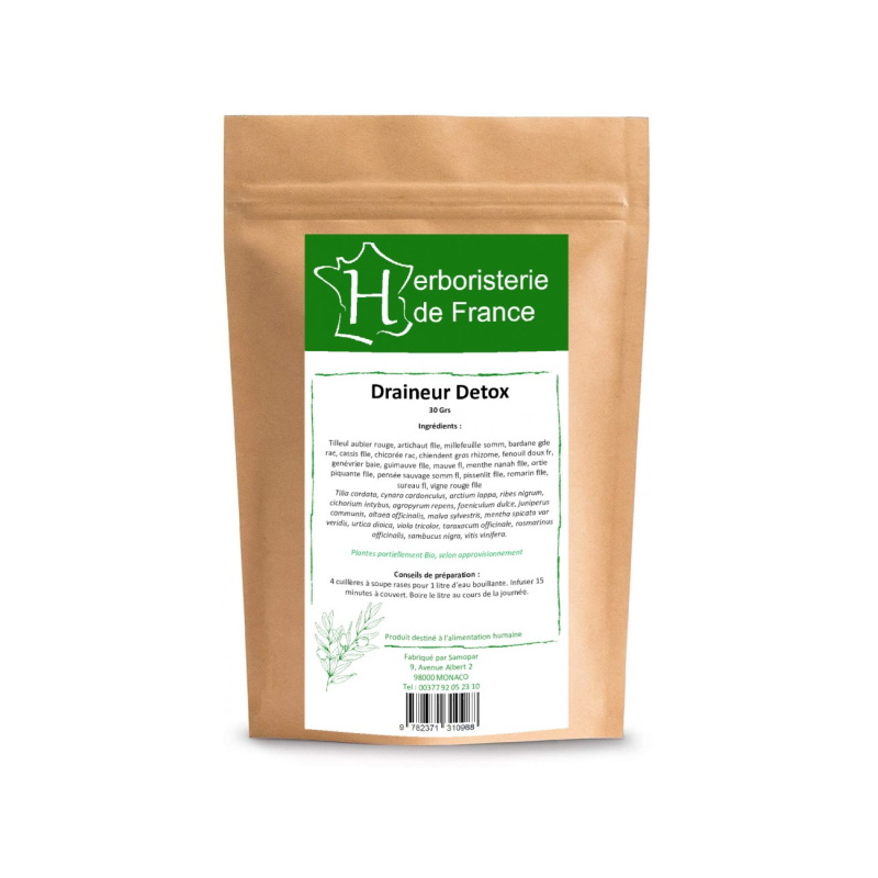 Pour aider votre organisme et avoir la mise en place de cures detox d'inter-saison ou de printemps en prenant 1 à 3 tisanes tout au long de la journée, pendant environ 30 jours, en y associant un régime alimentaire adapté sans sel et sans graisses saturées, on a choisi tout naturellement, Herboristerie De France Tisane Draineur Detox Vrac 30gr, pour des actifs comme l'aubier de tilleul rouge, les feuilles d'Artichaut, les sommités fleuries de Millefeuille, la grande racine de Bardane, la feuille de Cassis, la racine de Chicorée, le rhizome de Chiendent, le fruit de Fenouil doux, la baie de Genévrier, la feuille de Guimauve, la feuille de Mauve, la feuille de Menthe douce, la feuille d'Ortie piquante, les sommités fleuries de Pensée sauvage, la feuille de Pissenlit, la feuille de Romarin, la fleur de Sureau, la feuille de Vigne rouge.