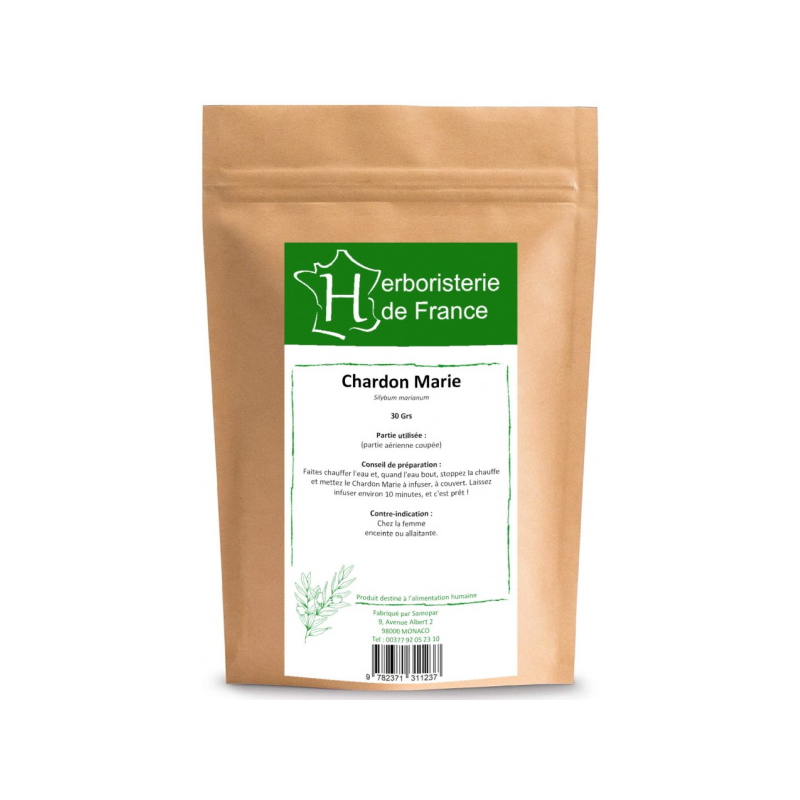 Herboristerie de France Tisane Chardon marie 30gr permet d'aider le foie dans sa fonction digestive et métabolique par l'apport de flavonoides antioxydants.