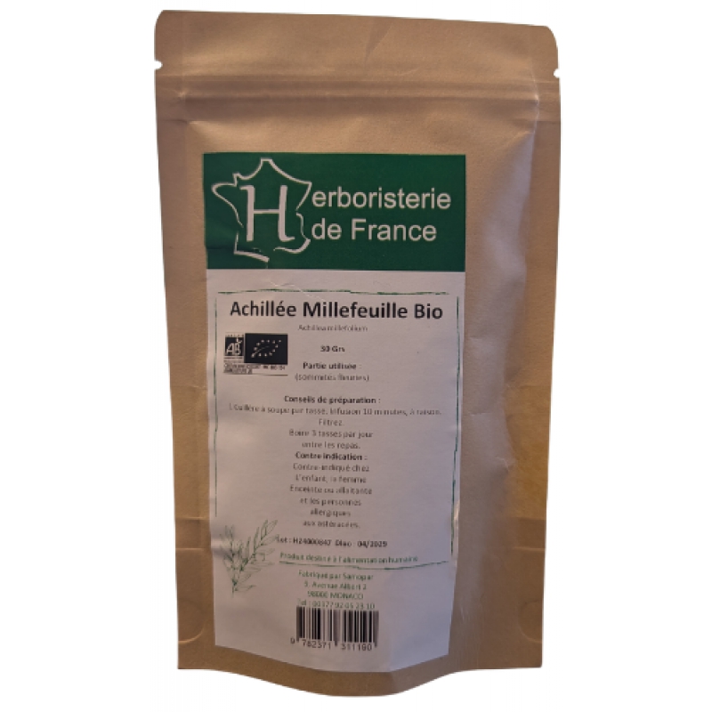 Herboristerie de France Tisane Achillée Millefeuille BIO 30 gr aide la femme en cas de perturbations du cycle menstruel et en cas de problèmes circulatoires veineux.
