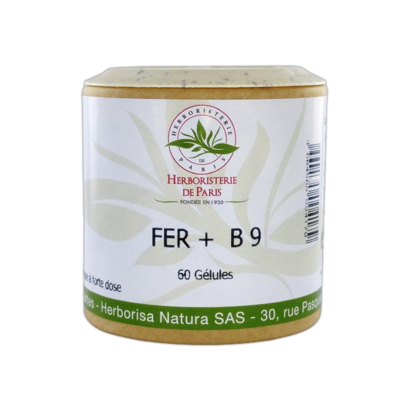 Herboristerie de Paris Fer plus B9 60 gélules permet d'apporter de l'acide folique et du lactate de fer pour aider comme anti-fatigue.