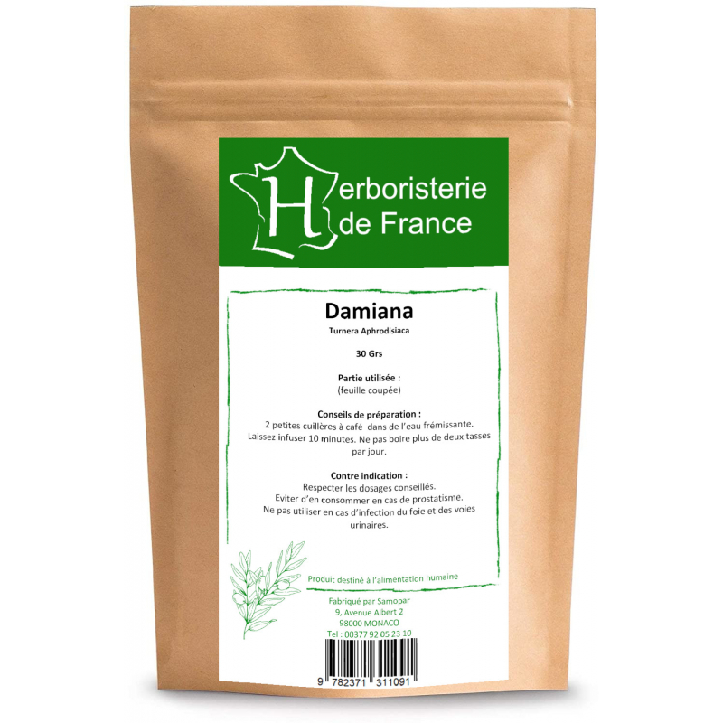 Herboristerie De France Tisane Damiana feuille coupée 30gr est un produit alimentaire pour préparation de tisane proposé par Onaturel, pour le bien-être de l'organisme.