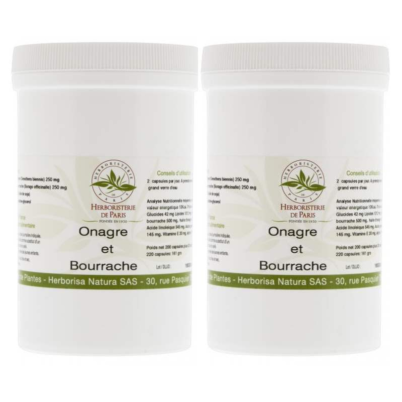 Herboristerie de Paris Huiles Bourrache Onagre lot de 2 X 220 capsules permet de faire une cure longue de plus de 3 mois de cure, pour entretenir sa peau.