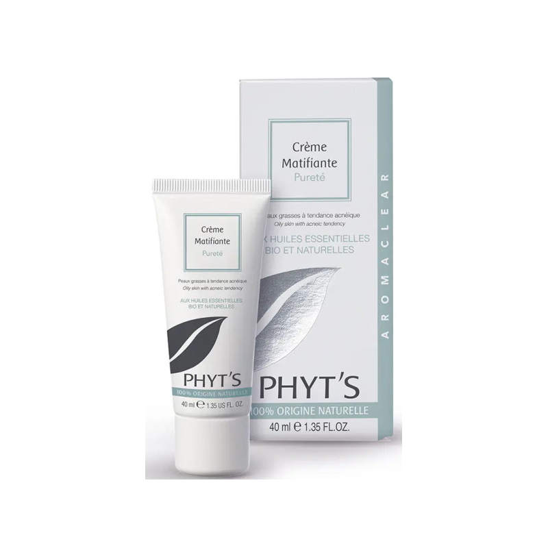 Phyt's Crème matifiante pureté AROMACLEAR 40 ml permet de supprimer les luisances des peaux adultes et grasses tout en aidant à éliminer les boutons, les imperfections et les brillances.