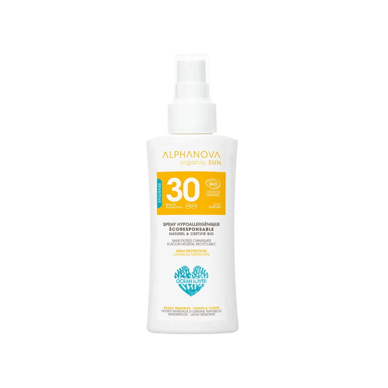 Alphanova Crème solaire hypoallergénique format voyage SPF30 90gr permet de protéger la peau délicate, la peau sensible de toute la famille, pour les petits et les grands.