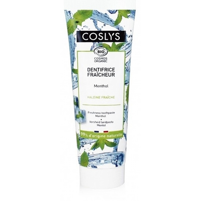 la propreté de vos dents et l'apport d'une haleine fraîche et mentholée sont permis par la pâte dentifrice aux extraits de plantes et au menthol, dans la tradition de production de Coslys, certifiés Non testé sur les Animaux, Ecocert, Cosmos Organic.