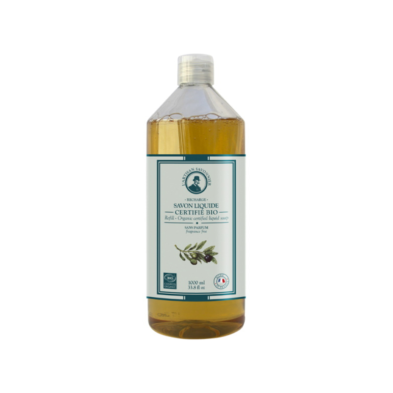 L'Artisan Savonnier Savon liquide certifié Bio sans parfum recharge 1L permet de recharger le savon liquide flacon de 500ml avec pompe doseuse.