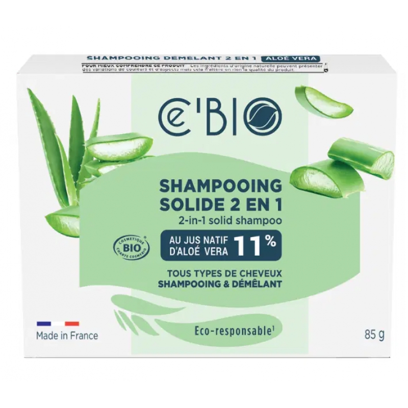 Cé'Bio Shampooing solide 2 en 1 Aloe Vera 85 gr permet de laver et de faire briller la fibre capillaire en cas de sécheresse et de cheveux ternes.