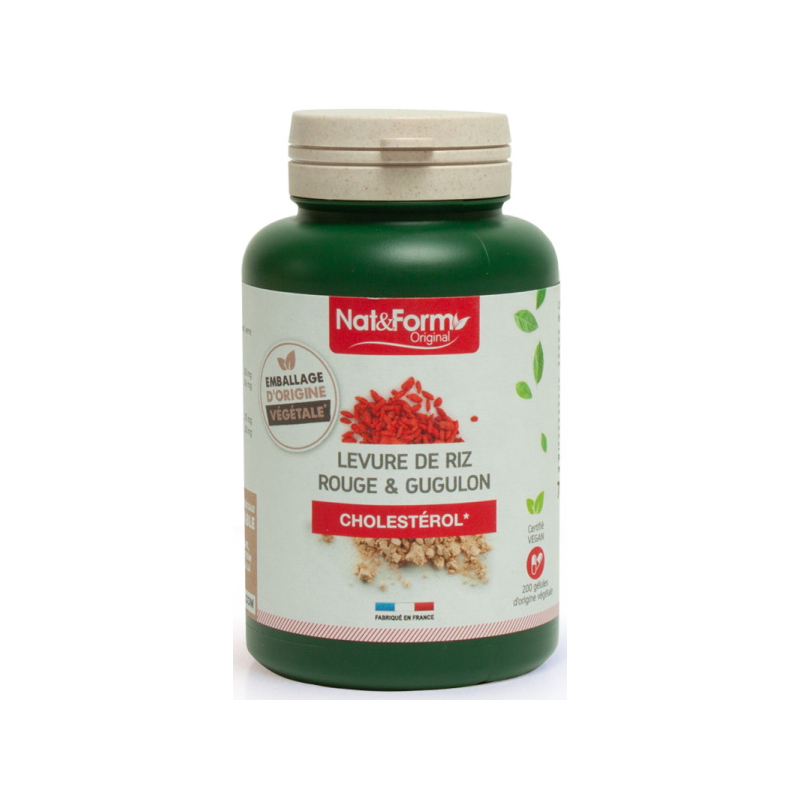 Nat et Form Levure de riz rouge et Gugulon 200 gélules permet d'apporter une synergie qui aide à normaliser le cholestérol sanguin.