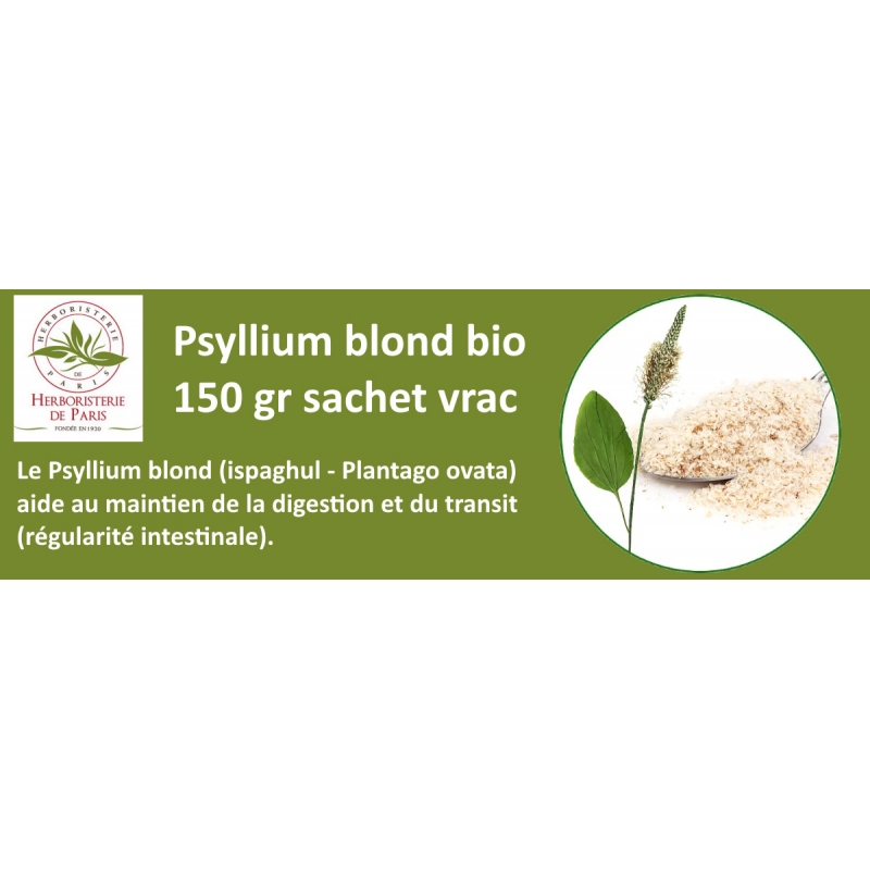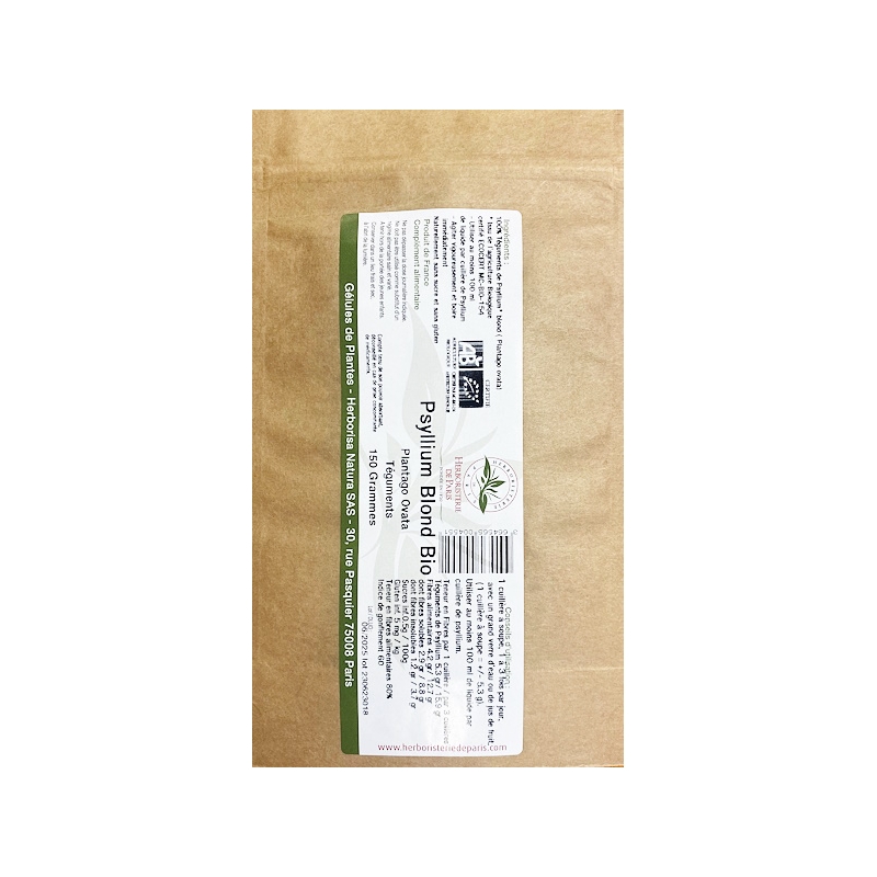 Pour aider le transit de votre organisme et avoir l'apport du maintien du cholestérol et du métabolisme lipidique, on vous propose sans hésitation, Herboristerie de Paris Psyllium blond Ispaghul Bio 150gr, pour des actifs comme le tégument de psyllium blond qui est une fibre alimentaire, de l'espèce plantago ovata (issu de l'agriculture biologique).