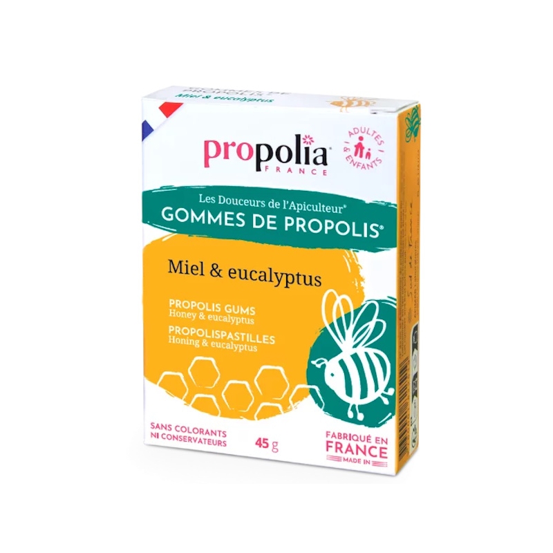 Pour votre bouche (et votre gorge) et avoir la santé des voies respiratoires (eucalyptus) et l'adoucissement des muqueuses (miel), on vous propose tout naturellement, Propolia Gommes de Propolis Miel Eucalyptus sachet de 45gr, pour des actifs comme la gomme arabique, le Sucre roux, le Miel, l'Extrait de Propolis purifiée, l'Huile Essentielle d'Eucalyptus (Eucalyptus globulus), les arômes naturels de Menthe et de Menthol (Traces de Cire de Carnauba et d'Amidon de Maïs).