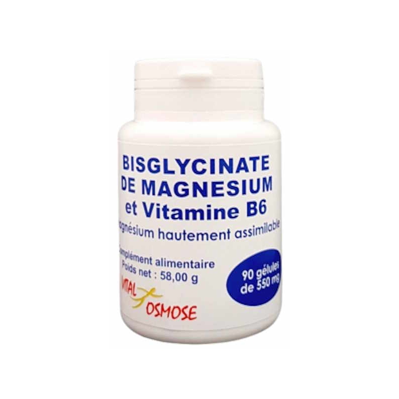Pour votre organisme et avoir l'apport d'une aide à l'équilibre électrolytique, à un métabolisme énergétique normal et au fonctionnement normal du système nerveux, on vous propose tout simplement, Vital Osmose Bisglycinate de Magnésium Vitamine B6 90 gélules, pour des actifs comme le magnésium apporté sous forme de bisglycinate de magnésium et la vitamine B6.