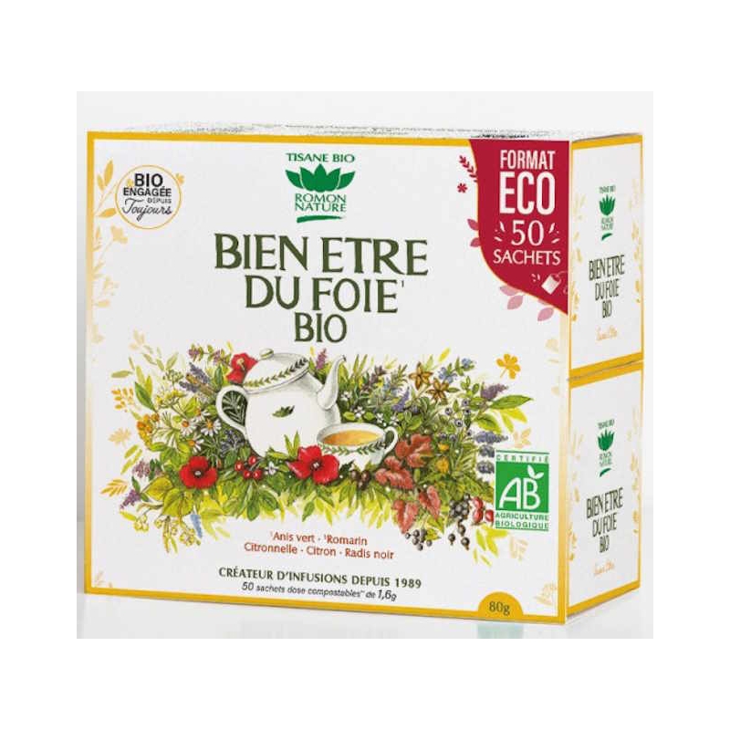 le maintien de la santé du foie et l'aide au drainage hépato-biliaire (par le romarin) sont permis par ce complexe Foie vésicule (format éco de 50 sachets d'infusion), dans la tradition de production de Romon Nature, certifiés Non testé sur les Animaux, AB, fabriqué en France.