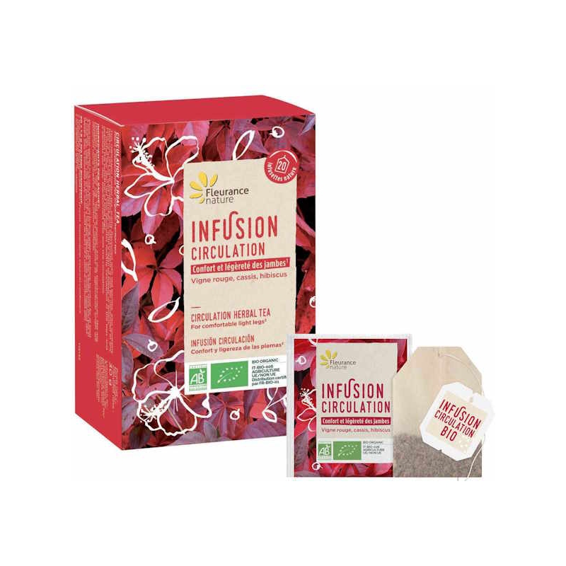 Pour votre organisme et avoir la conservation de la santé vasculaire et de la circulation sanguine par l'hibiscus, on vous propose tout simplement, Fleurance Nature Tisane Circulation Bio 20 sachets, pour des actifs comme les Fleurs d'hibiscus, les feuilles de vigne rouge, les baies de cassis, les feuilles de myrtille, l'arôme fruits rouges.