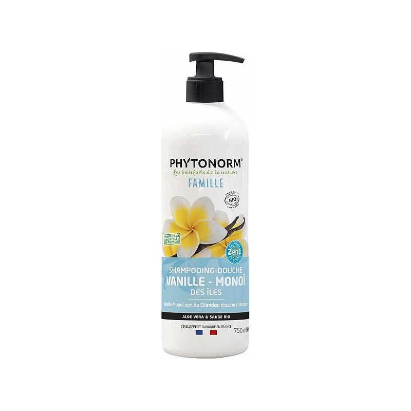 Phytonorm Shampooing douche Vanille Monoï des Iles 750ml permet d'apporter beaucoup de douceur la peau et aux cheveux de toute la famille.
