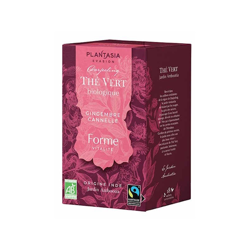 Plantasia Thé vert Forme Gingembre Cannelle 18 sachets permet d'apporter une synergie de thé Vert de Darjeeling section Ambootia, de cannelle et de gingembre.