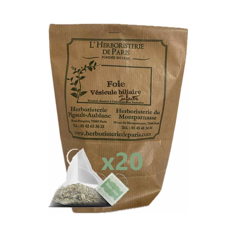 Herboristerie de Paris Tisane Foie Vésicule Biliaire 20 infusettes concentrées de 2gr permet de préparer une infusion pour aider au maintien de la santé du foie (par le romarin).