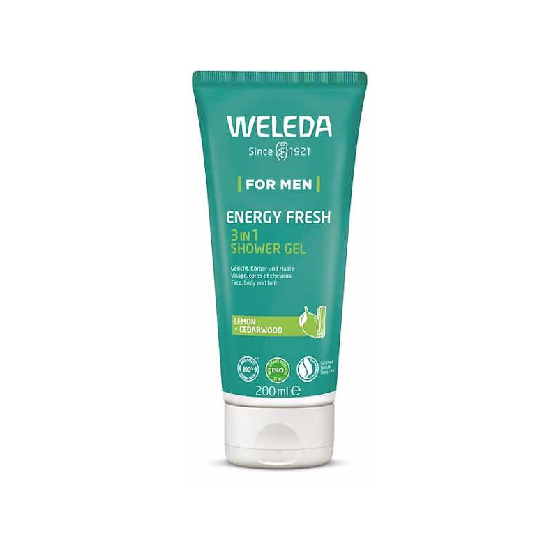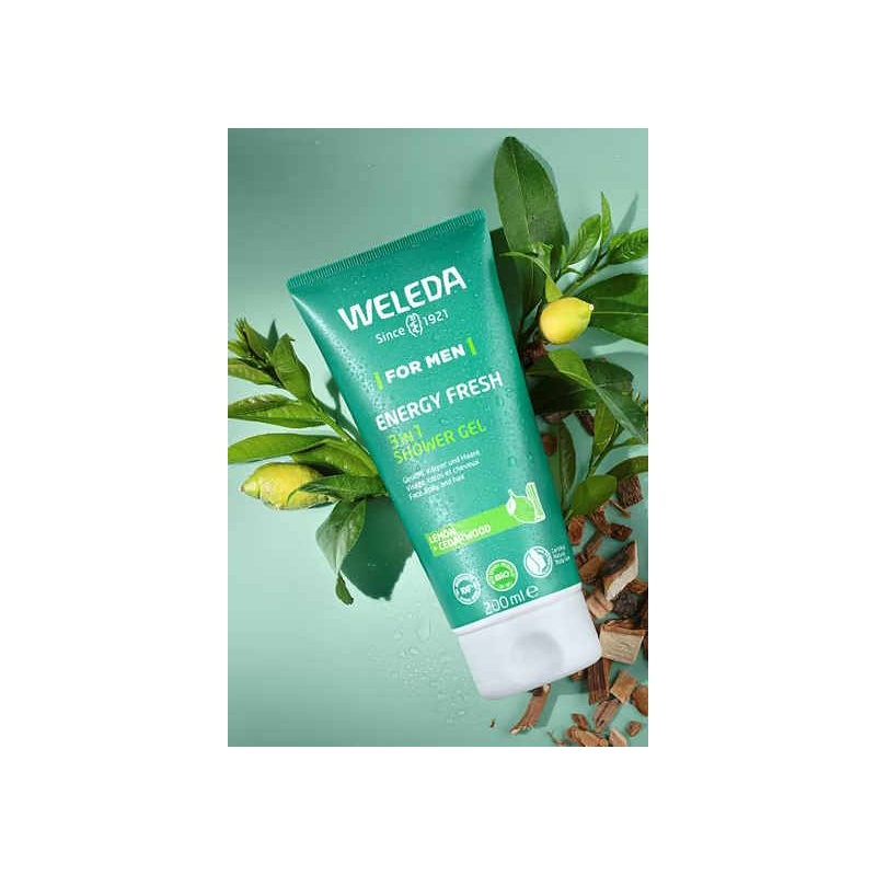 Weleda Gel Douche Men 3 en 1 Energy Fresh pour Homme 200ml est élaboré avec une base lavante végétale, des matières lipidiques naturelles et des extraits de citron et de bois de cèdre.