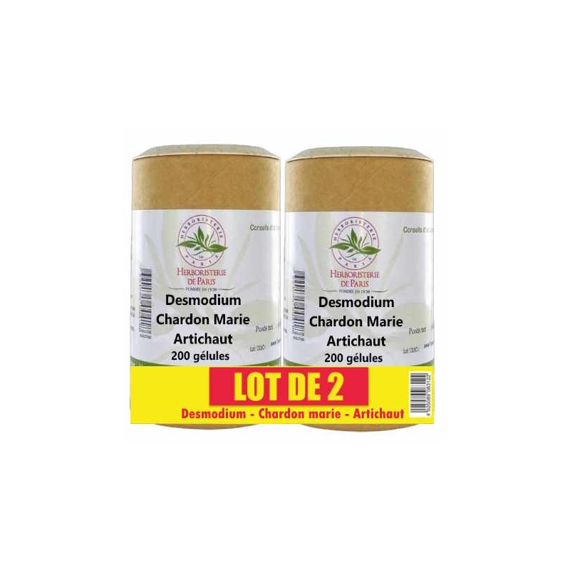 Herboristerie de paris Lot de 2 Desmodium Chardon marie Curcuma Artichaut 2x200 gélules apporte 400 gélules de cure d'aide hépatique pour plus de 3 mois de cure.