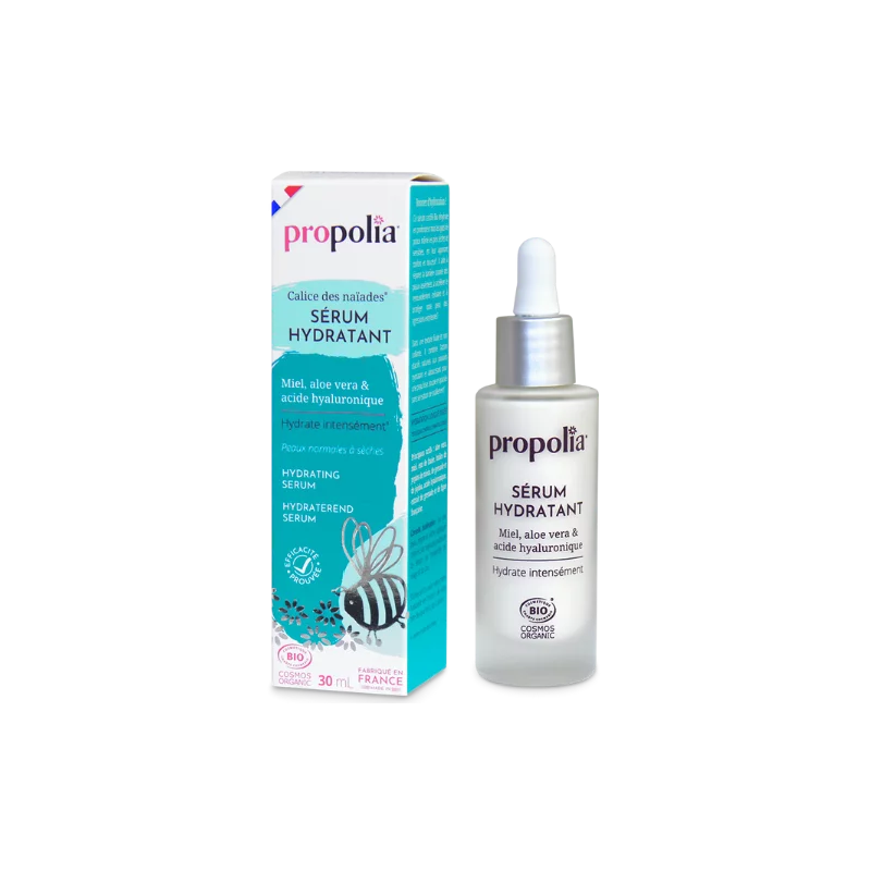 Ce Sérum hydratant Miel Aloe vera et Acide hyaluronique 30ml Propolia certifié Bio hydrate intensément tous les types de peau, y compris les plus sèches et sensibles, en leur offrant confort et douceur.