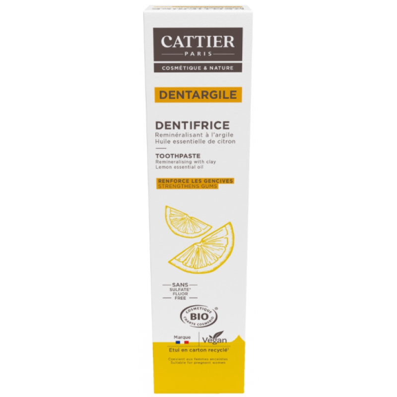 Le Dentifrice Dentargile reminéralisant au Citron gencives irritées 75 ml contient de l’argile et de l’huile essentielle de citron. Ces composants 100 % naturels fournissent des minéraux, nettoient la plaque dentaire et fortifient l’émail tout en évitant les saignements.