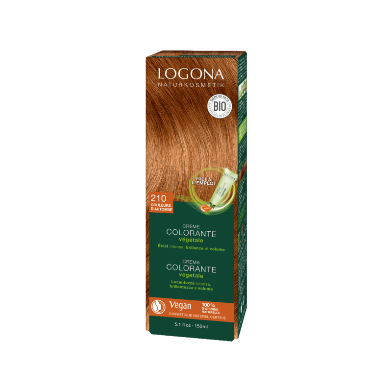 Pour que votre chevelure puisse avoir reflets cuivrés et soin, Logona Crème colorante Couleurs d'Automne cheveux chatains apporte un concentré de coloration végétale : glycérine, jus de betterave, argile, extrait de camomille, extrait de henné naturel Lawsonia, extrait de romarin et acide citrique.
