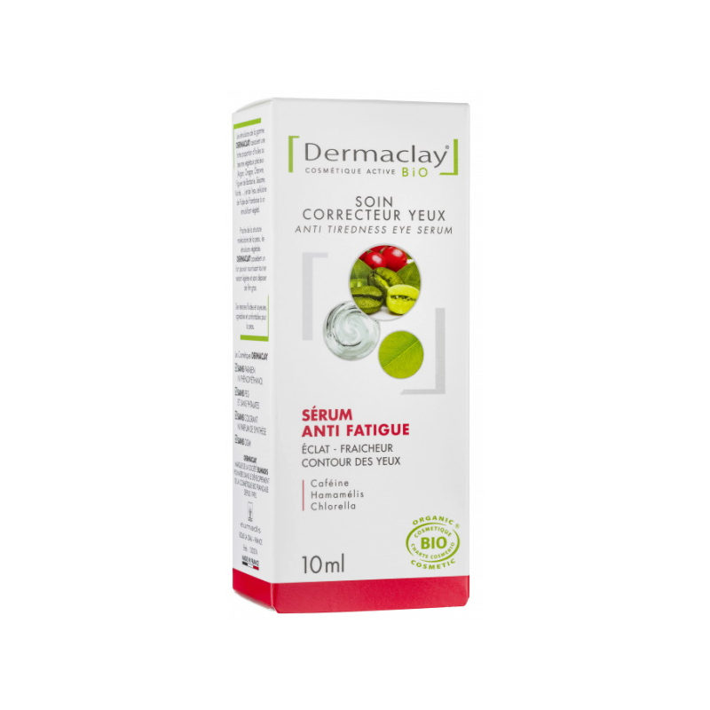 Pour embellir votre visage (et surtout le contour des yeux) et avoir la nutrition de votre visage, on vous propose tout naturellement, Dermaclay Sérum Correcteur Contour Yeux Anti Fatigue 10ml, pour des actifs comme le jus d'aloe vera, l'extrait de framboise, la caféine, l'extrait d'hamamélis, la dermochlorella, l'huile de jojoba, l'extrait de café, l'extrait d'avoine.